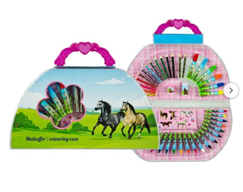 Teken kofferPaarden kleurkoffer met 12 mini kleurpotloden, 6 stiften,24 wascos, 2 potloden, 4 kleurplaten, gum, puntenslijper, en1 stickervel. Geschikt voor kinderen vanaf 3 jaar.